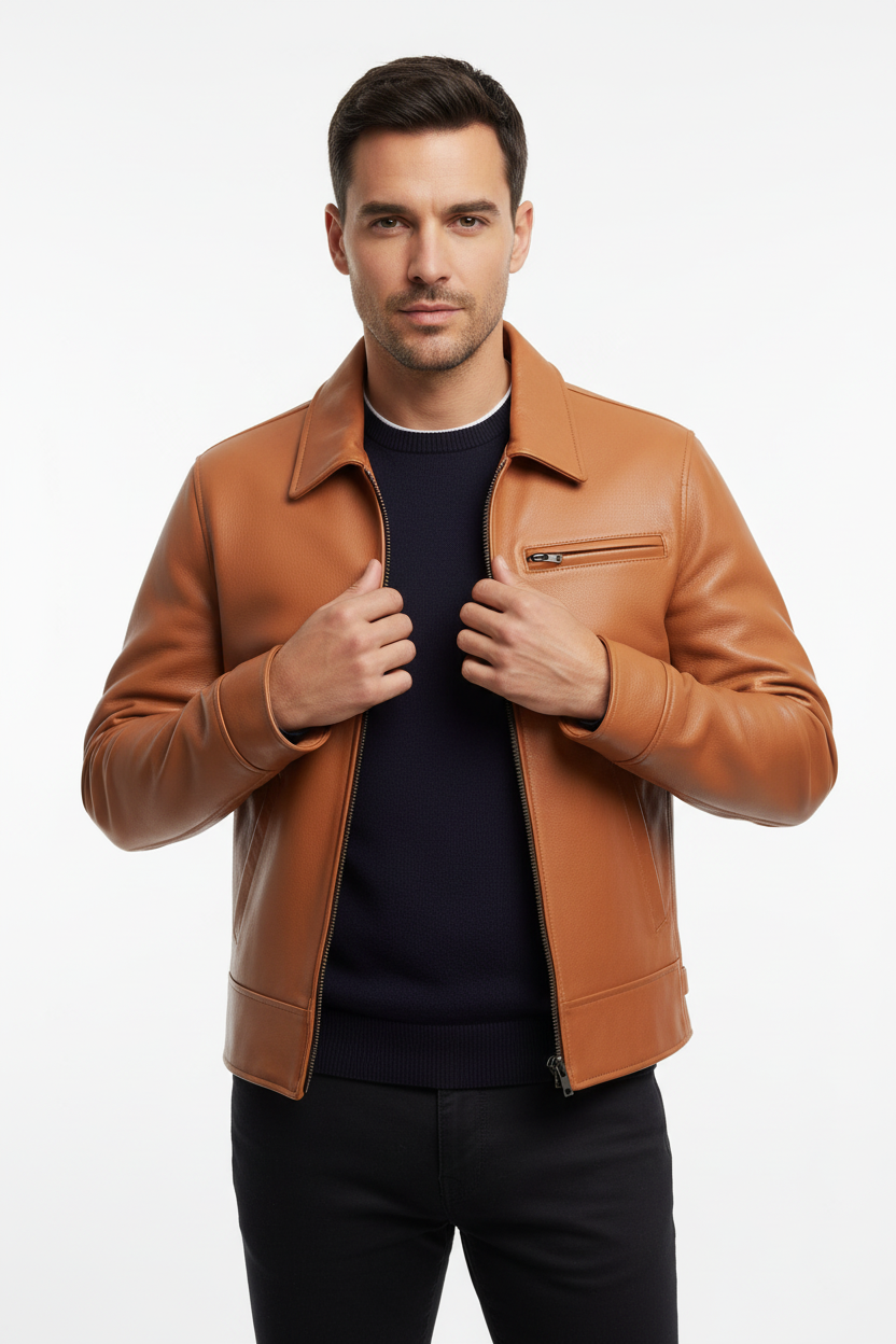 This men's genuine leather jacket is cut from tanned top-layer cowhide — the densest, most resilient grade of real hide. The warm cognac-tan finish deepens with every wear. This isn't a jacket for one season. It's one you'll still reach for a decade from now.