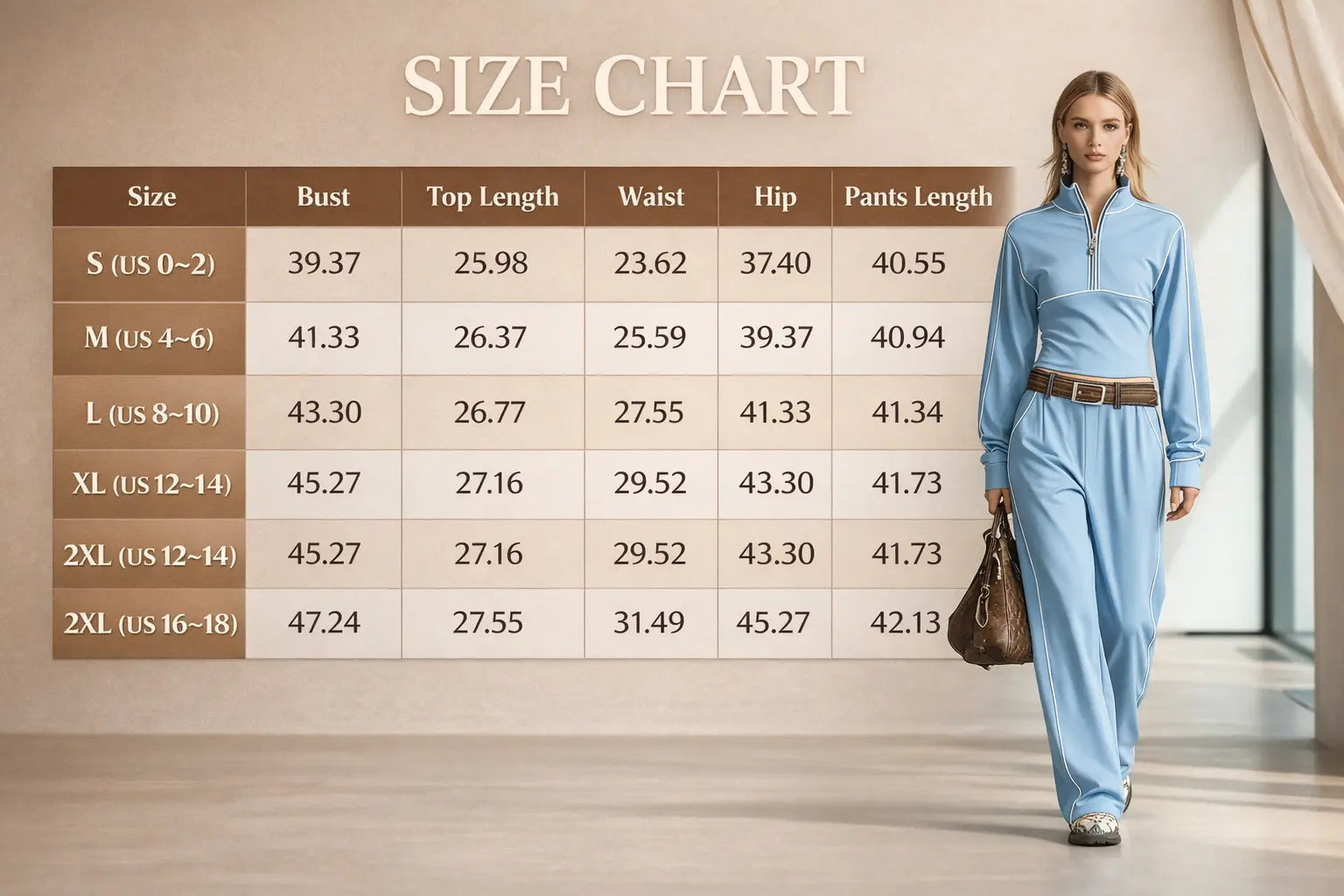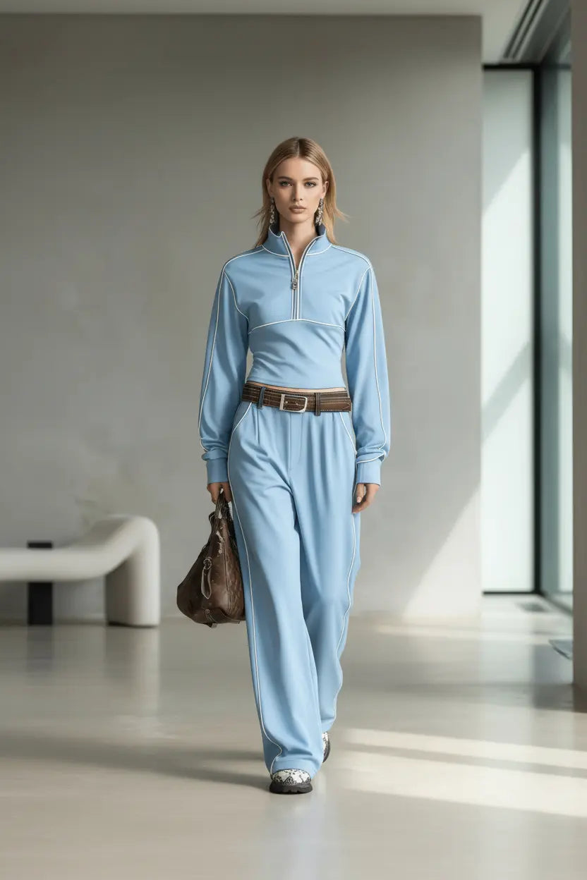 The short stand-up collar and half-zip top create a clean, waist-defining silhouette. Paired with high-waisted wide-leg pants, the set visually elongates the body while offering relaxed freedom.