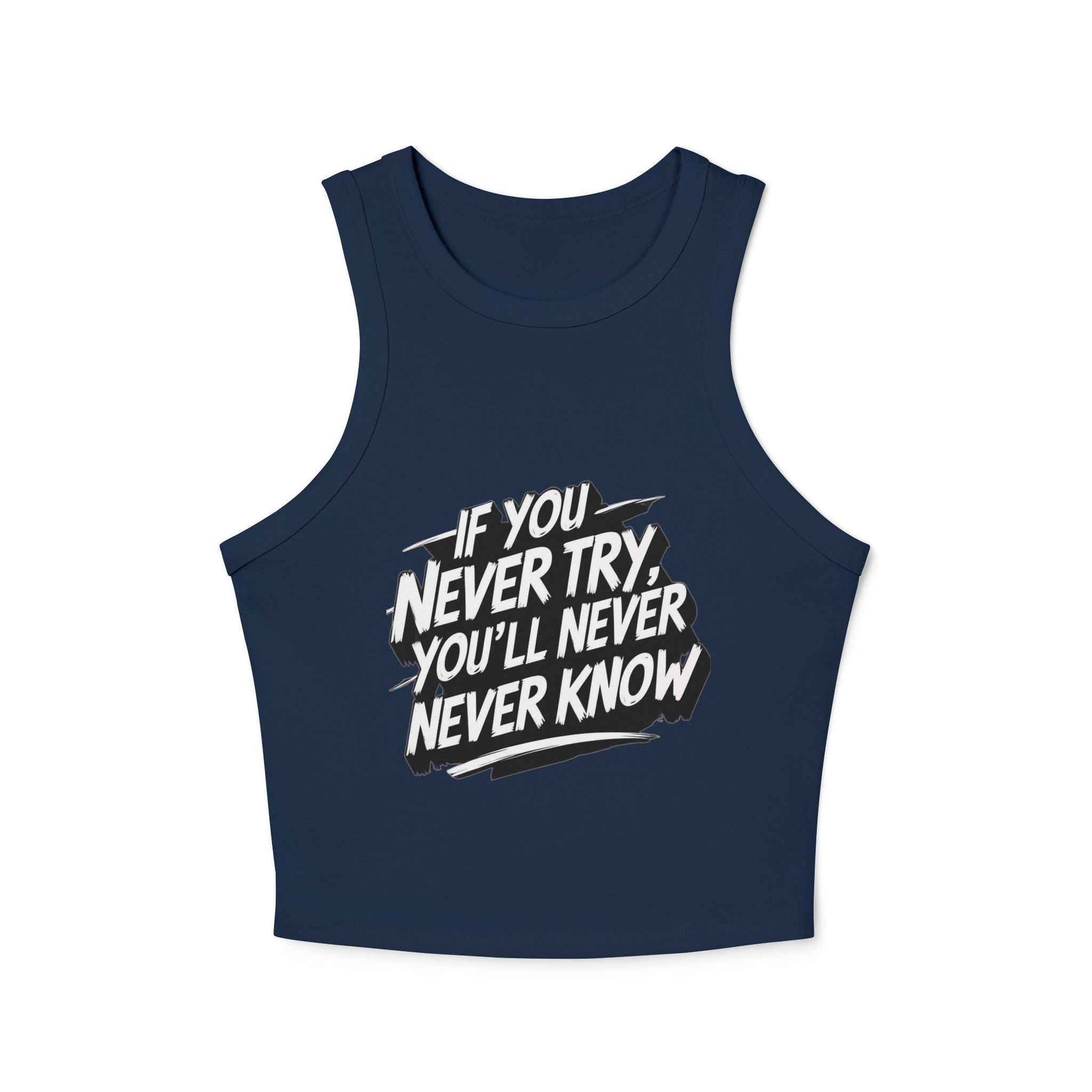 Navy blue women's racer tank top with motivational text