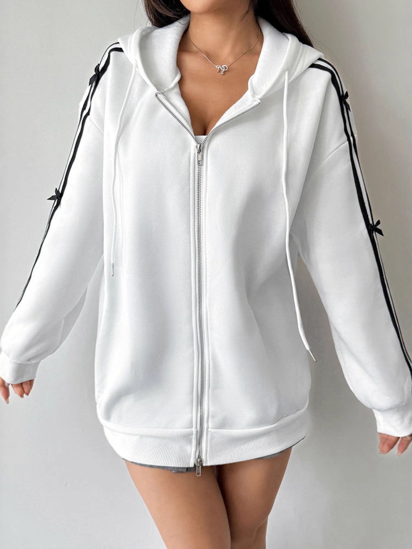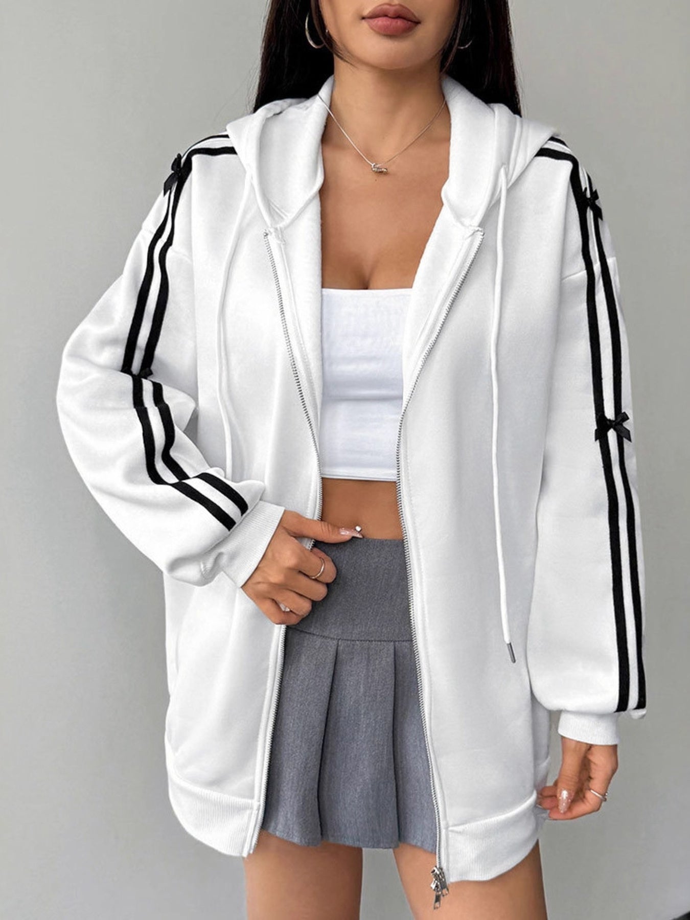 striped sleeve hoodie women zip up detail casual outfit