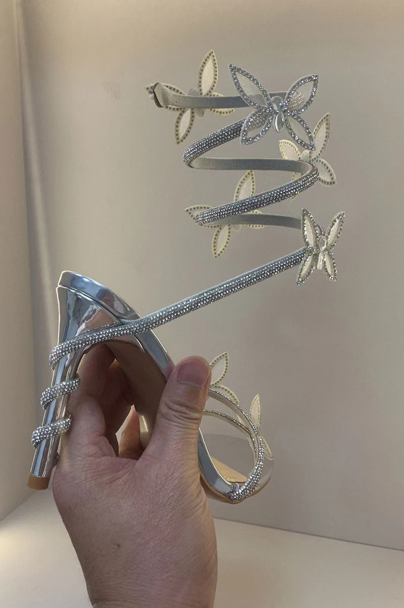 women's rhinestone stiletto sandals silver butterfly detail close up luxury finish