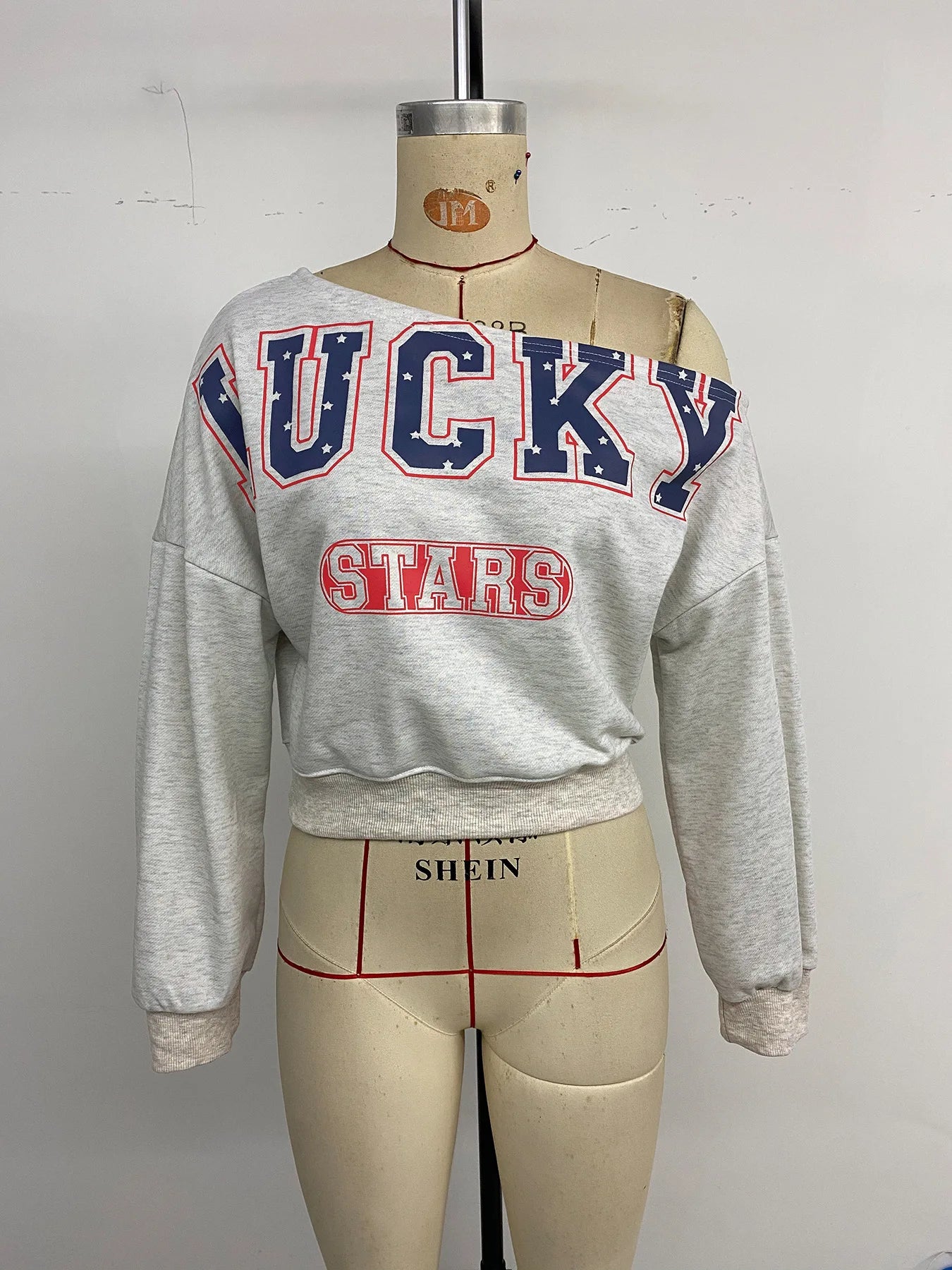 | Design | Off shoulder, letter print, cropped length, full sleeves |